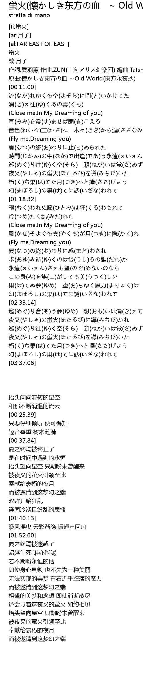 | [00:08.00] | 原曲:懐かしき東方の血 ~Old World(東方永夜抄) |