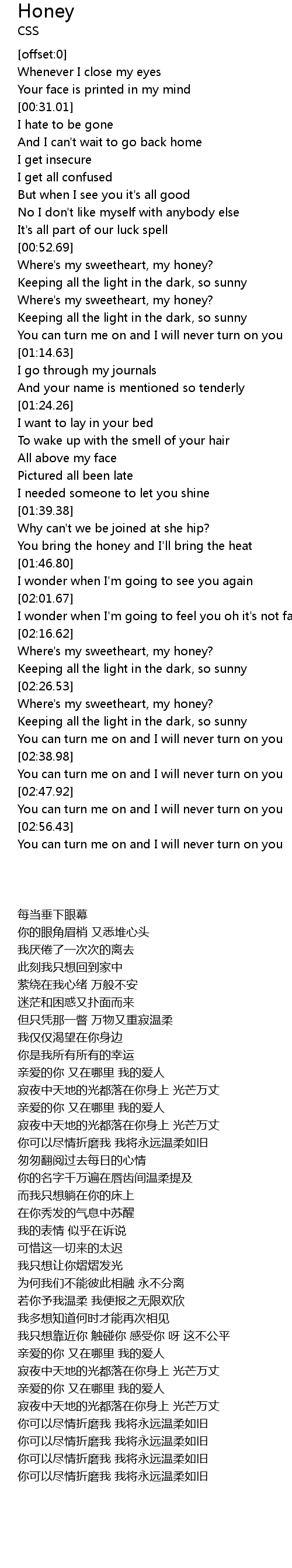 | [00:54.96] | Where's my sweetheart, my honey? |