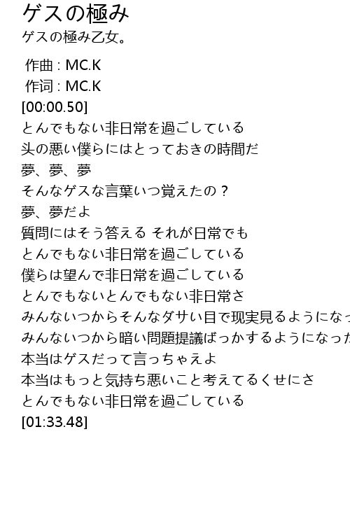 | [00:37.31] | とんでもない非日常を過ごしている 僕らは望んで非日常を過ごしている |