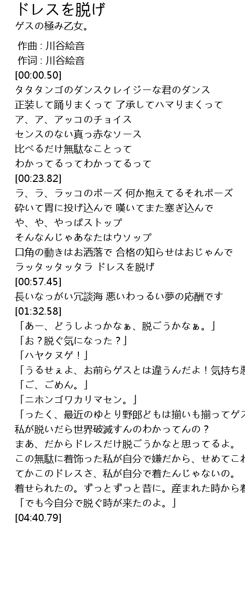 | [00:45.93] | ラッタッタッタラ ドレスを脱げ |