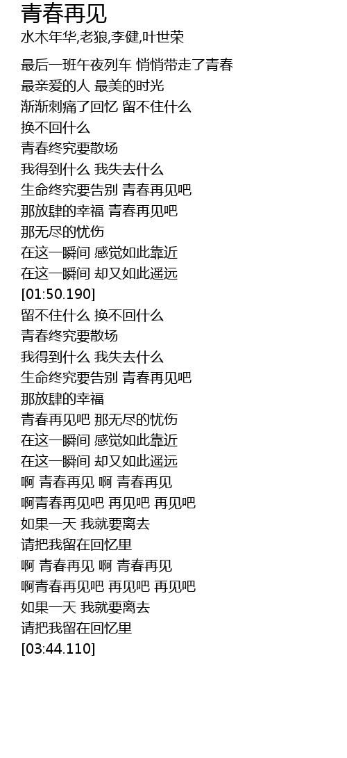 | [03:29.550] | a qīng chūn zài jiàn ba zài jiàn ba zài jiàn ba |