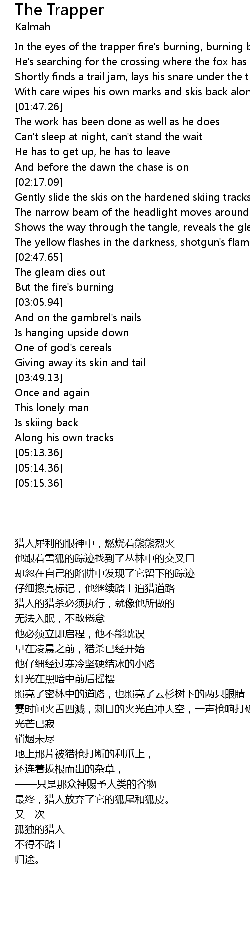 [01:17.13] In the eyes of the trapper fire's burning, burning bright