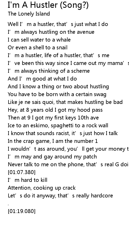 | [00:20.750] | I' m a hustler, life of a hustler, that' s me |