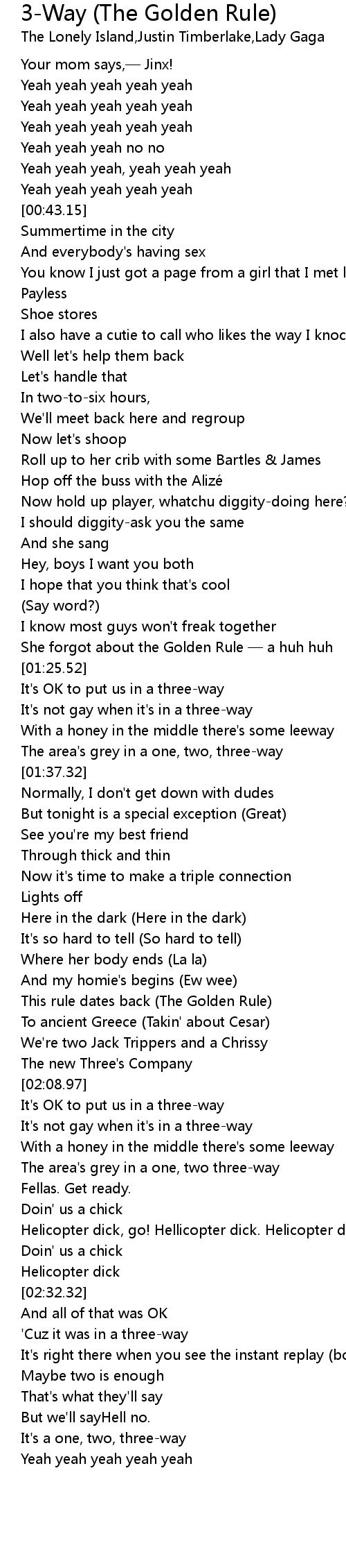 | [02:12.39] | It's not gay when it's in a three-way |
