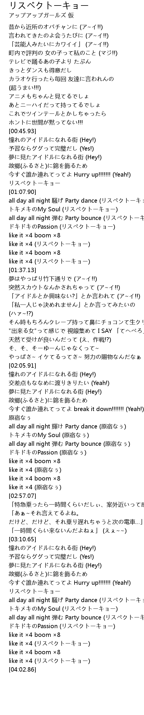 | [01:08.31] | all day all night 騒げ Party dance (リスペクトーキョー) |