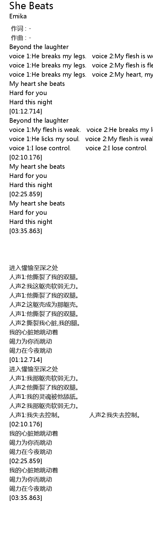 | [00:47.514] | voice 1:He breaks my legs. voice 2:My flesh is weak. |