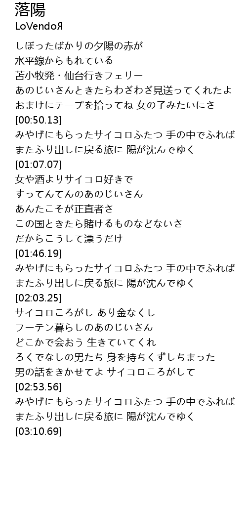 | [00:59.13] | またふり出しに戻る旅に 陽が沈んでゆく |