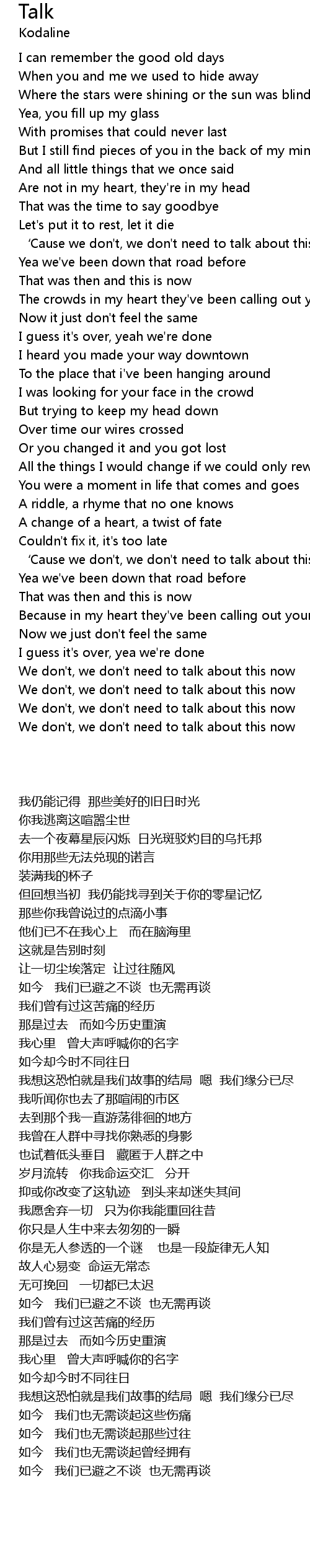 | [02:24.200] | ' Cause we don' t, we don' t need to talk about this now |