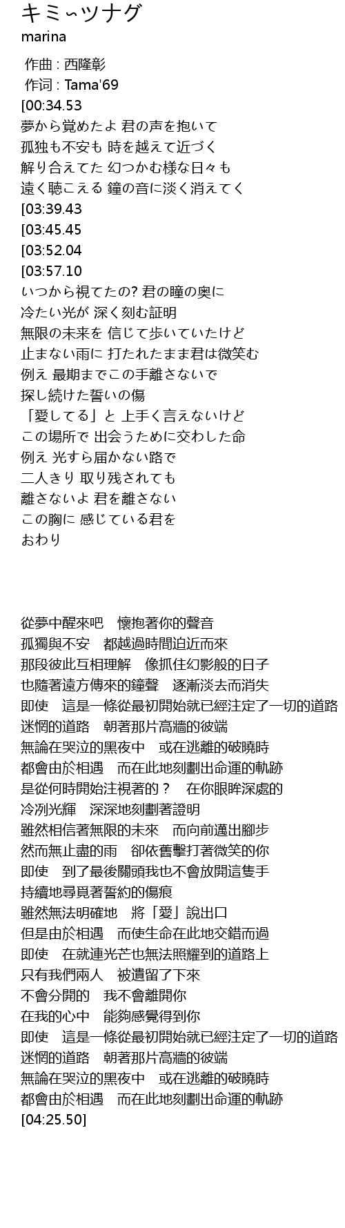 | [01:18.12][03:57.10] | この場所で 出会うための運命の轍 |