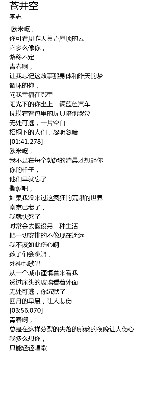 | [03:59.220] | 总是在这样分裂的失落的煎熬的夜晚让人伤心 |