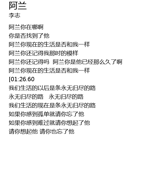 | [01:04.20] | 阿兰你现在的生活是否和我一样 阿兰你还记得我那时的模样 |