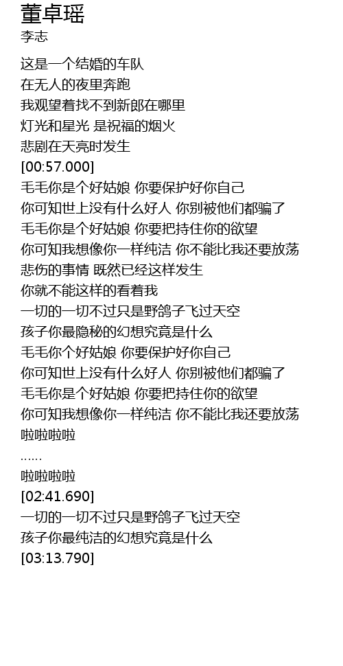 | [02:03.730] | 毛毛你是个好姑娘 你要把持住你的欲望 |