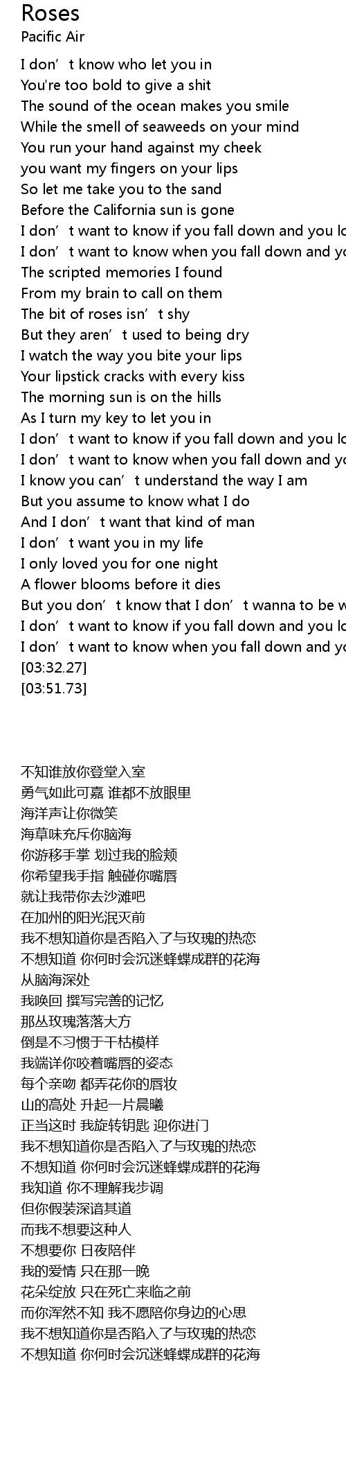 | [03:28.37] | I don’t want to know when you fall down and you love roses |