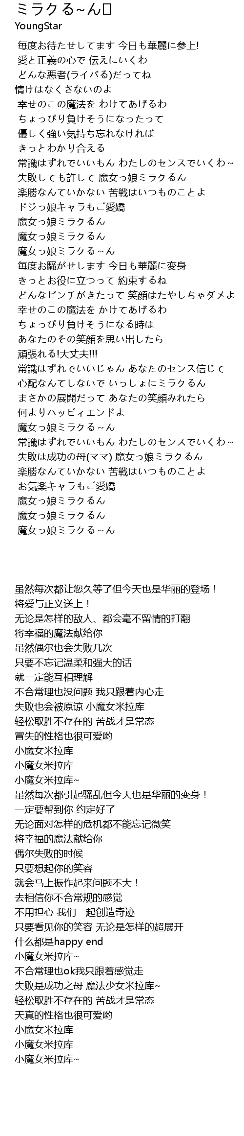 | [02:34.544] | 心配なんてしないで いっしょにミラクるん |