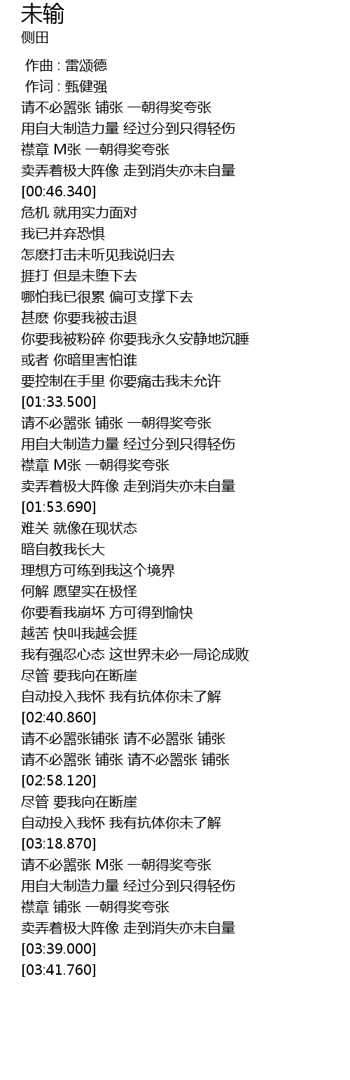 | [03:19.100] | 请不必嚣张 M张 一朝得奖夸张 |