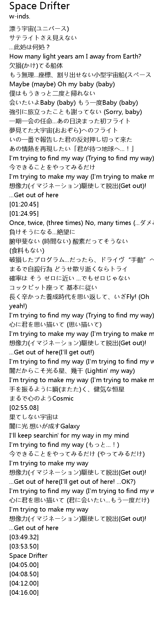 | [01:39.35] | 腑甲斐ない (時間ない) 酸素だってそうない (食料もない) |