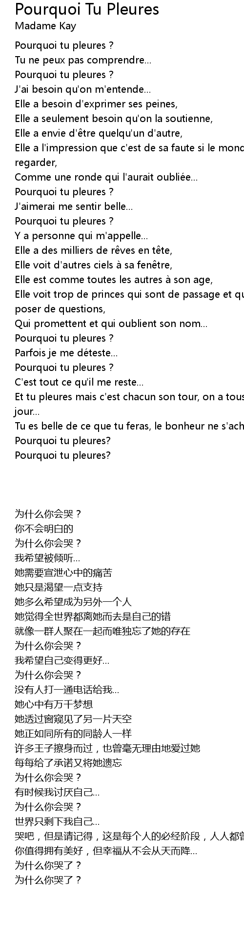 | [02:24.190] | Et tu pleures mais c' est chacun son tour, on a tous e te seuls un jour... |
