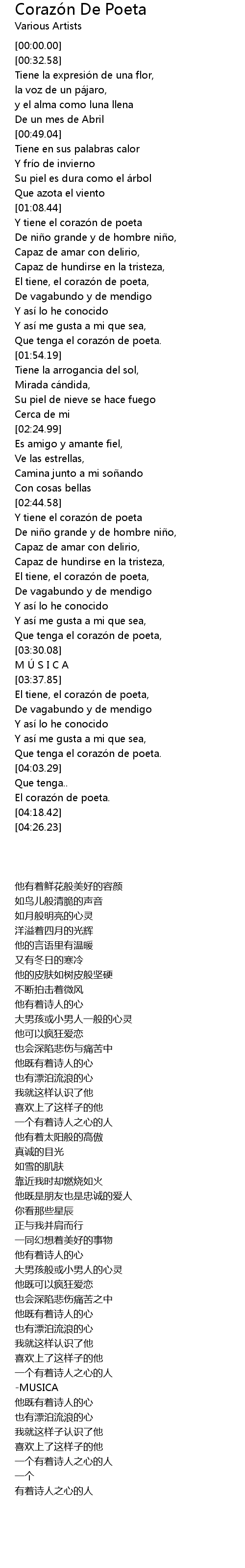 | [03:56.77] | Que tenga el corazó n de poeta. |