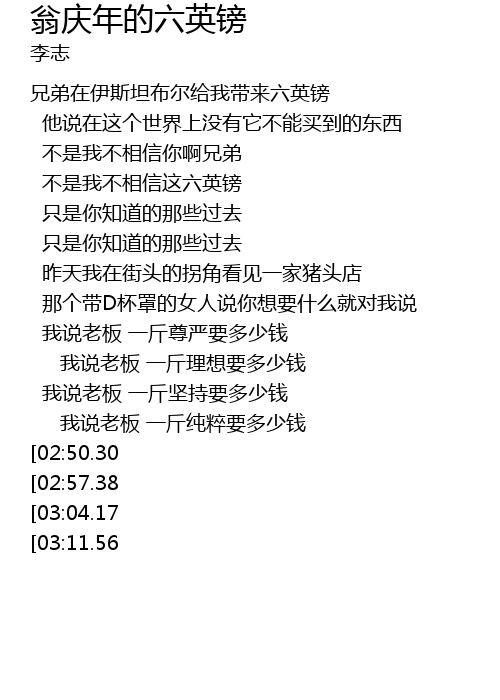 | [03:19.12][02:50.30] | 我说朋友 一斤爱情要多少钱 |