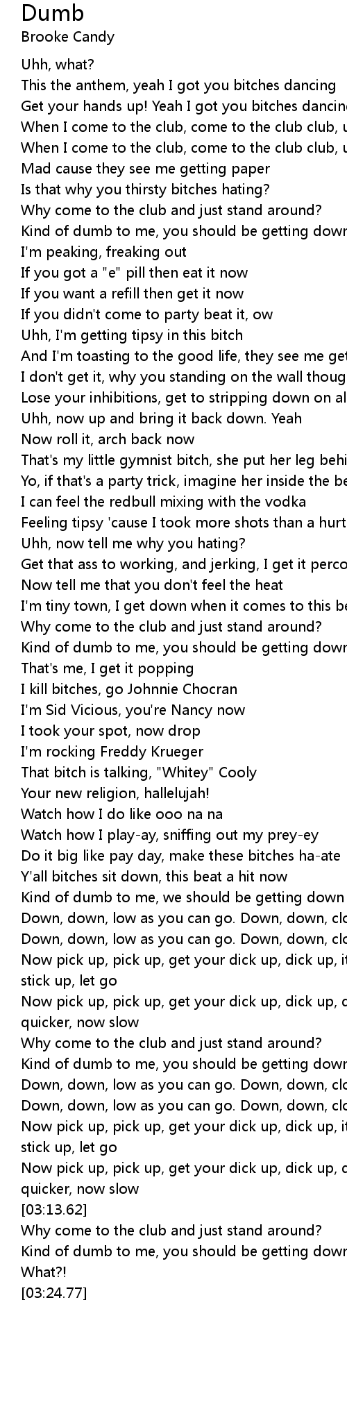 [03:06.07] Now pick up, pick up, get your dick up, dick up, do it quicker, quicker, now slow
