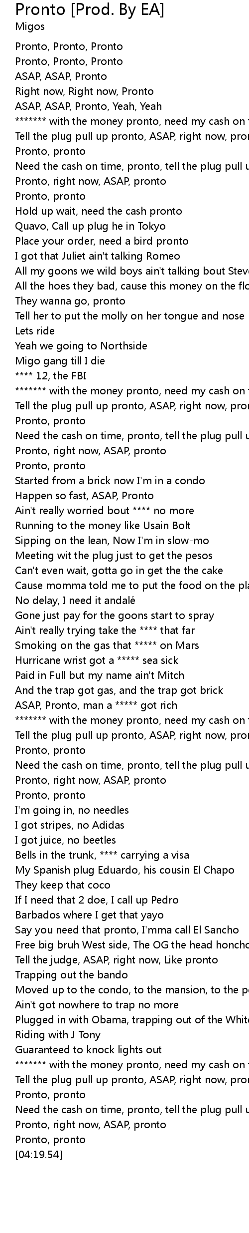 | [00:34.19] | ******* with the money pronto, need my cash on time pronto |