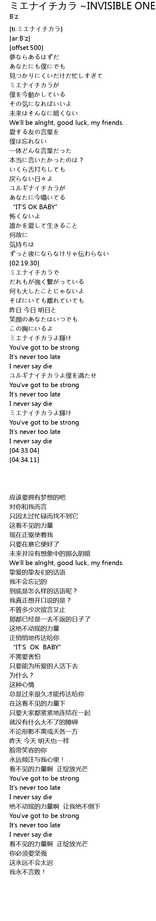 | [04:11.61] | ミエナイチカラよ輝け |