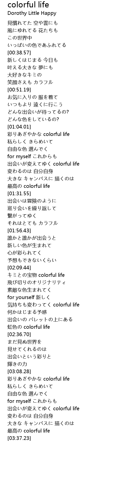 | [03:10.73] | 彩りあざやかな colorful life |