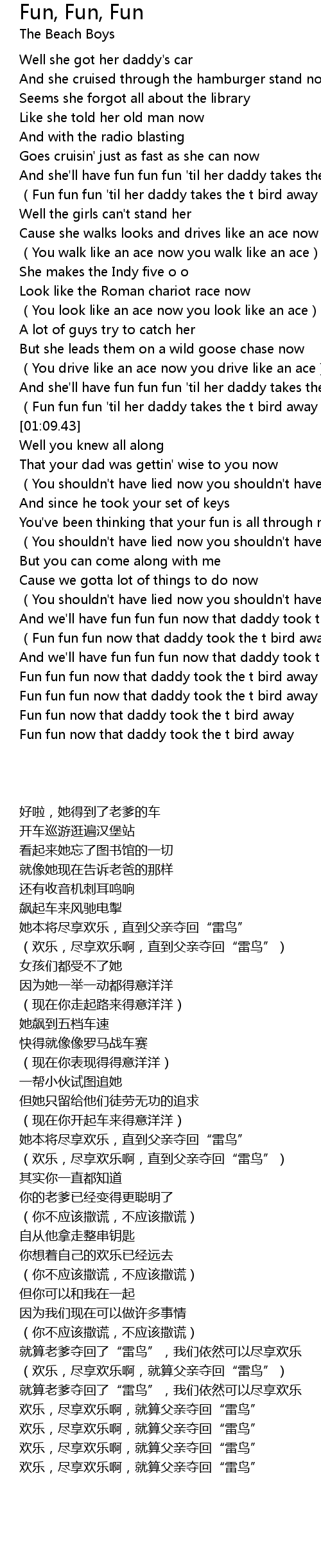 | [00:40.59] | Fun fun fun ' til her daddy takes the t bird away |