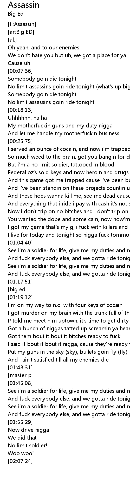 No limit assassins goin ride tonight (what's up big ed nigga) |