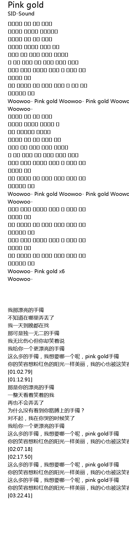 | [01:02.79] | Woowoo Pink gold Woowoo Pink gold Woowoo Pink gold |