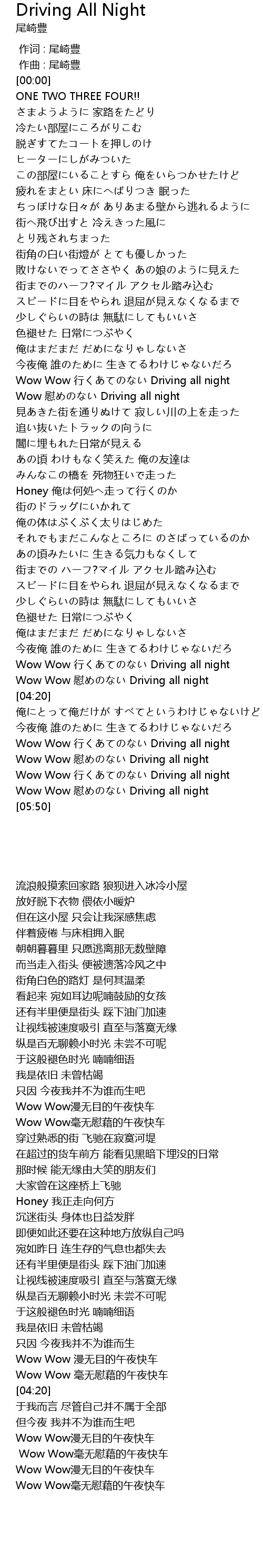 | [04:57.60] | Wow Wow 行くあてのない Driving all night |