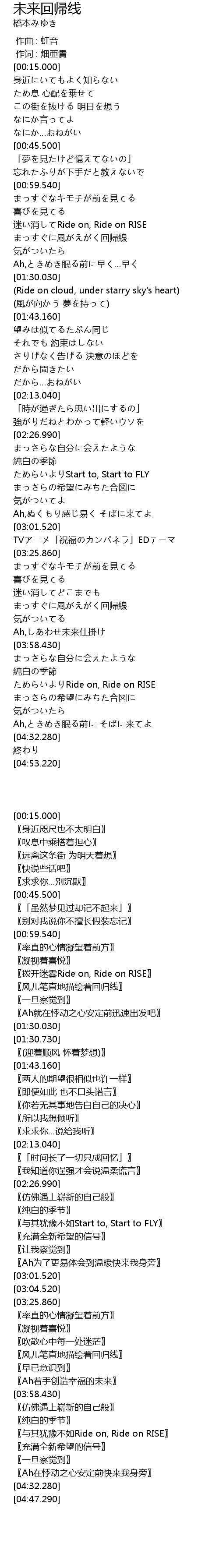 | [01:09.450] | mí xiāo Ride on, Ride on RISE |