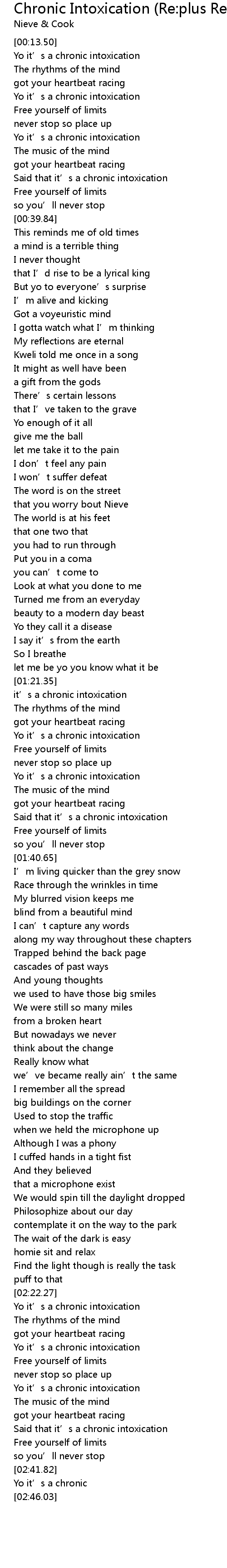 | [02:22.53] | Yo it' s a chronic intoxication |