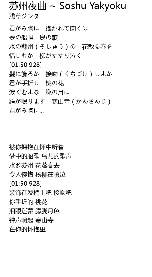 | [01:30.427] | 水の蘇州(そしゅう)の 花散る春を |