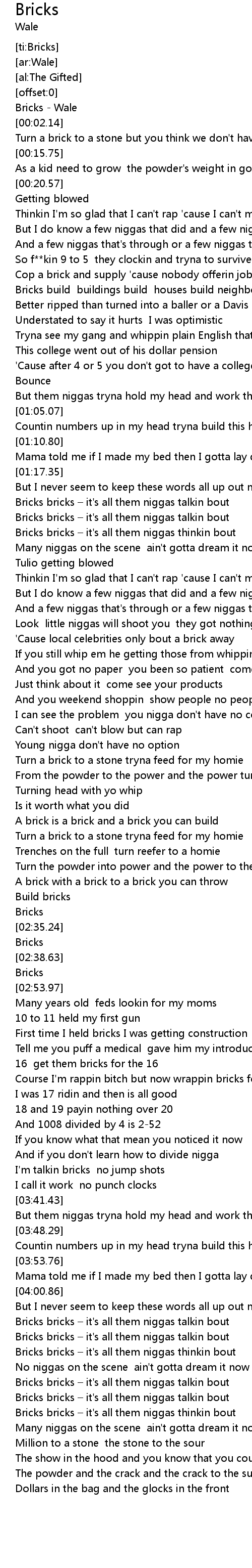| [04:16.27] | Bricks bricks – it's all them niggas talkin bout |