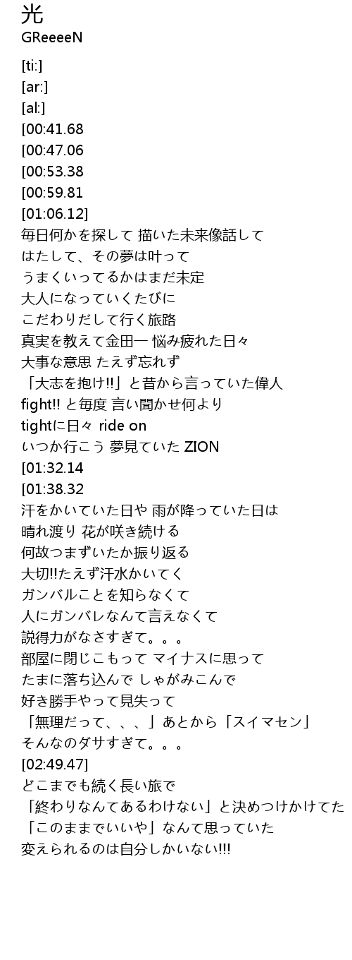 | [02:37.44][00:53.38] | 走り疲れた日や 闇に迷っていた日は |