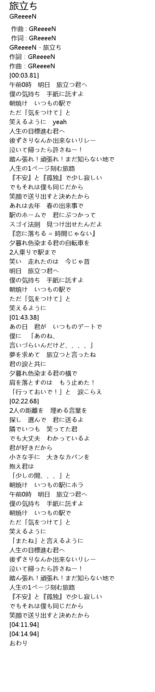 | [00:04.81] | 午前0時 明日 旅立つ君ヘ |