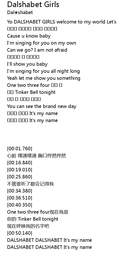 | [00:01.760] | Yo DALSHABET GIRLS welcome to my world Let' s go hu |