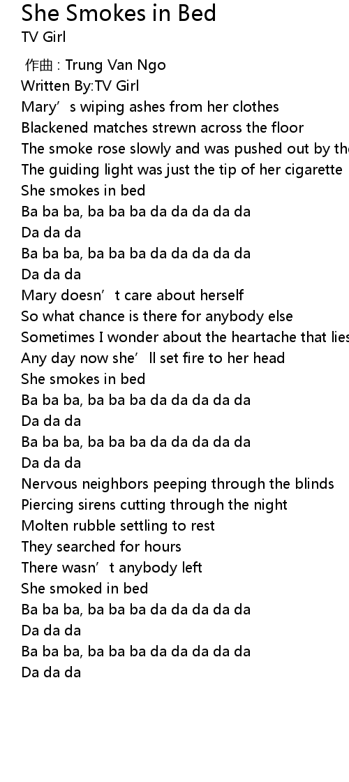| [00:45.13] | The guiding light was just the tip of her cigarette |