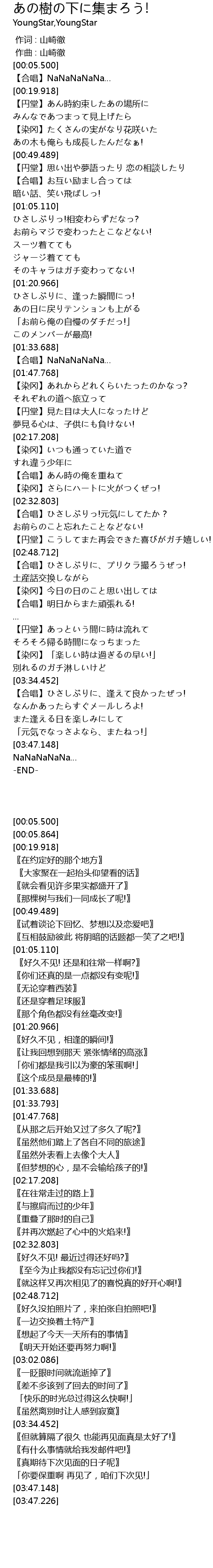 | [00:43.977] | あの木も俺らも成長したんだなぁ! |