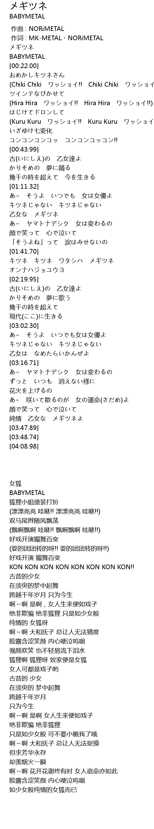 | [02:04.26] | キツネ キツネ ワタシハ メギツネ |