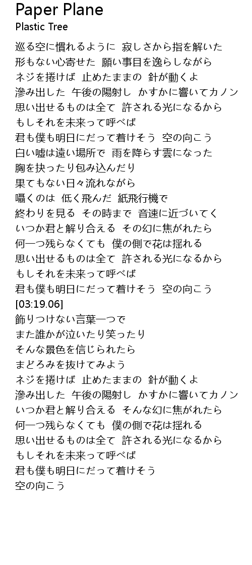 | [02:08.73] | 囁くのは 低く飛んだ 紙飛行機で |