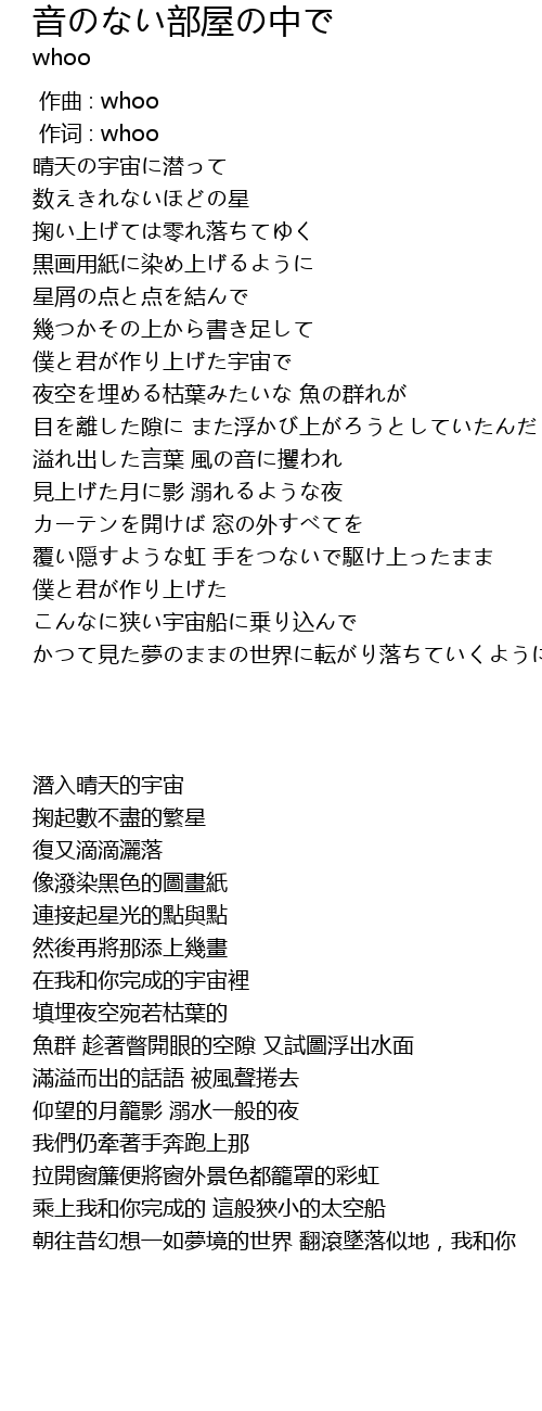 | [02:33.67] | 僕と君が作り上げた こんなに狭い宇宙船に乗り込んで |