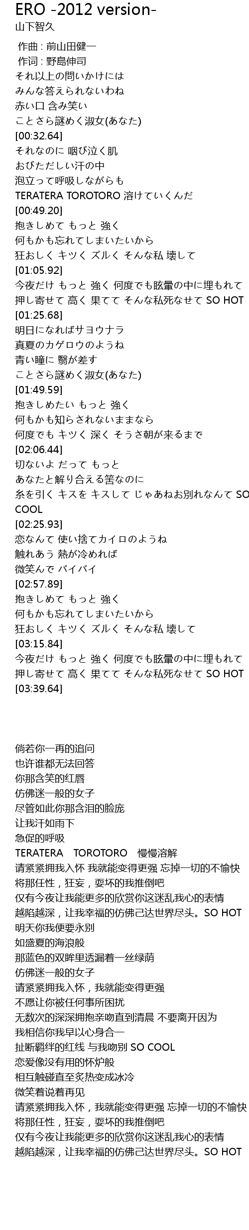 | [01:14.92] | 押し寄せて 高く 果てて そんな私死なせて SO HOT |