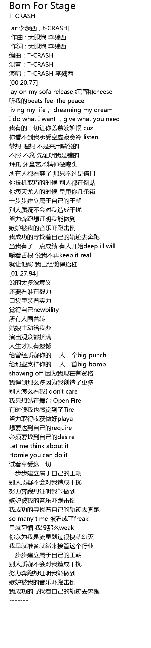 | [01:55.79] | wǒ zhǐ xiǎng zhàn zài wǔ tái Open Fire |