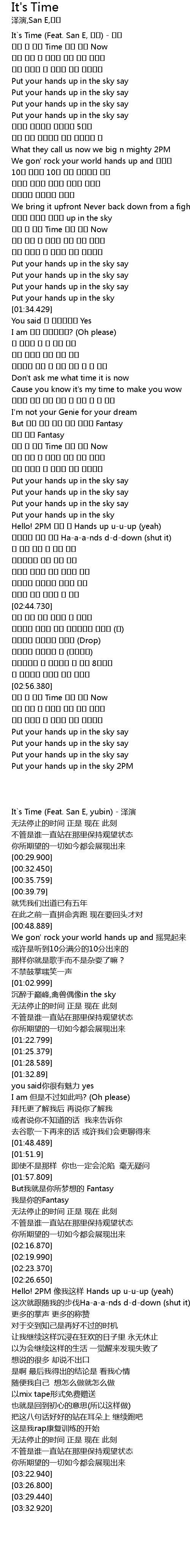 | [00:02.929] | It`s Time (Feat. San E, 유빈) - 택연 |