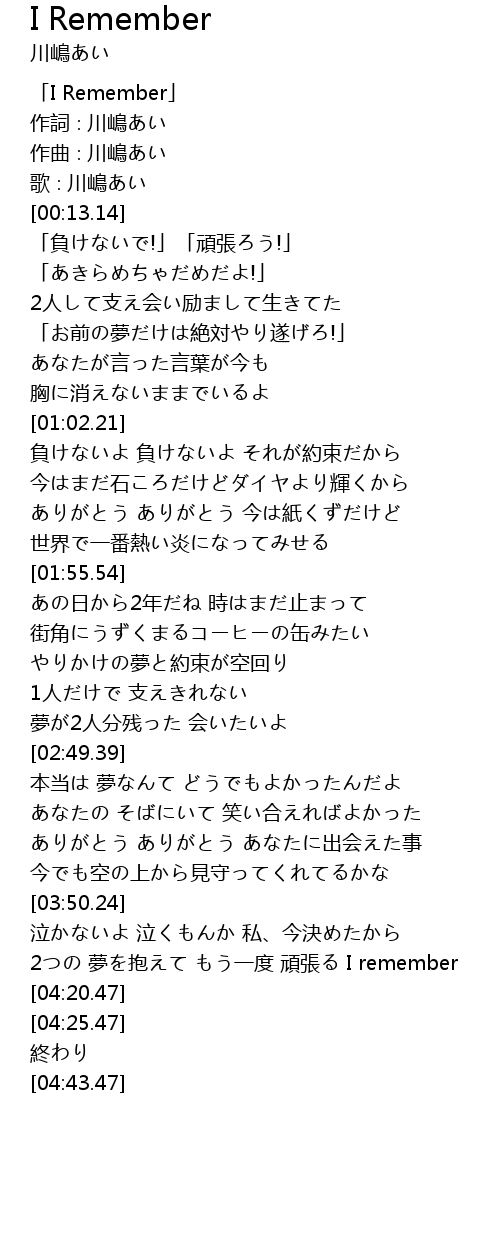 | [04:05.14] | 2つの 夢を抱えて もう一度 頑張る I remember |