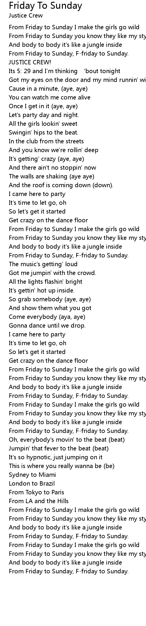 | From Friday to Sunday, Ffriday to Sunday. | |