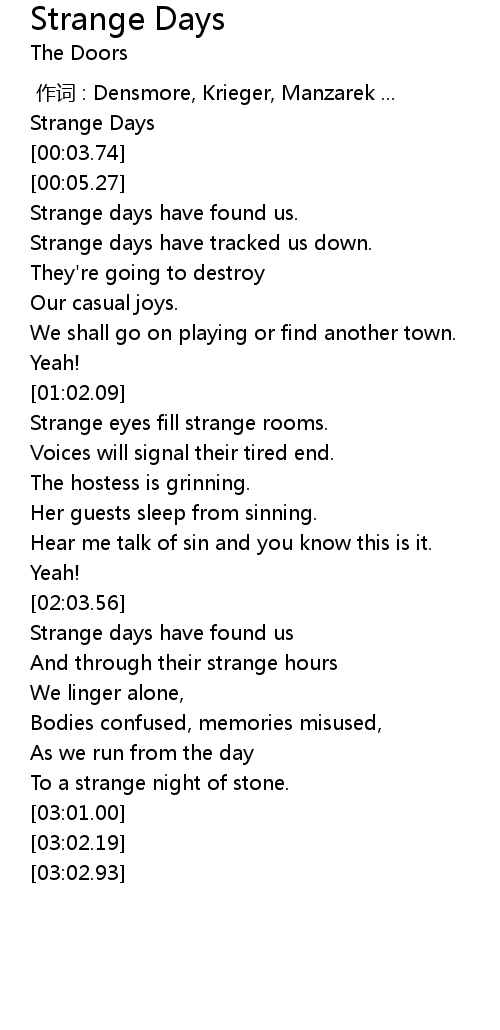 | [00:00.00] | 作词 : Densmore, Krieger, Manzarek ... |