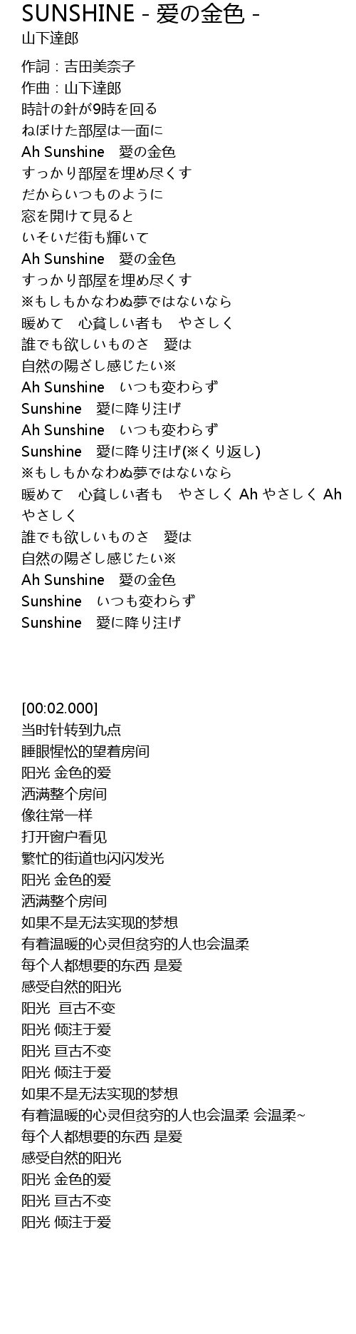 | [02:22.697] | Sunshine 愛に降り注げ(※くり返し) |